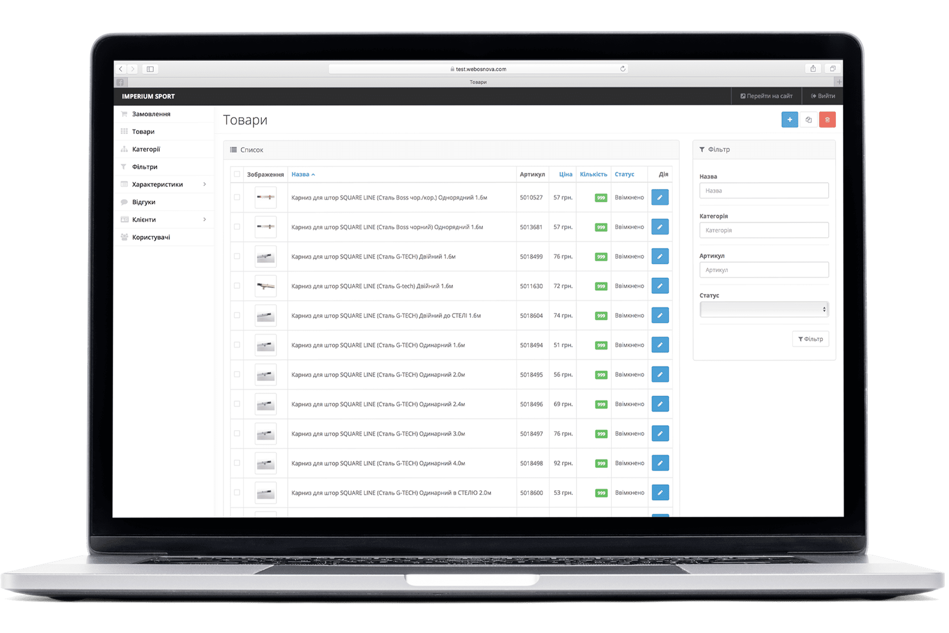 Адміністративна частина сайту має необхідний функціонал для зручної роботи з контент-частиною ваших товарів чи послуг. Реалізована зручна структура керування номенклатурою; Ви можете додавати та коригувати товарні позиції, створювати чи прибирати категорії, працювати з фільтрами та характеристиками, зручно опрацьовувати замовлення, керувати відгуками та оцінками. Більш детально розповідаємо у відео-огляді.